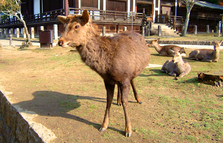 鹿。後ろに見える建物は三月堂(法華堂)。